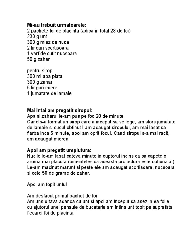 Baclava foile de placinta le taiem la marimea tavii in care vom coace, apoi le impartim in 3. Coacem o ora si 30 minute la 165 grade celsius, dar in functie de cuptor poate dura mai mult sau mai putin. Ma bucura si ma incanta, reteta originala contine osanza si untura, cu adevarat este reteta pentru placinte si baclava, iar pentru turtele de ajunul craciunului.