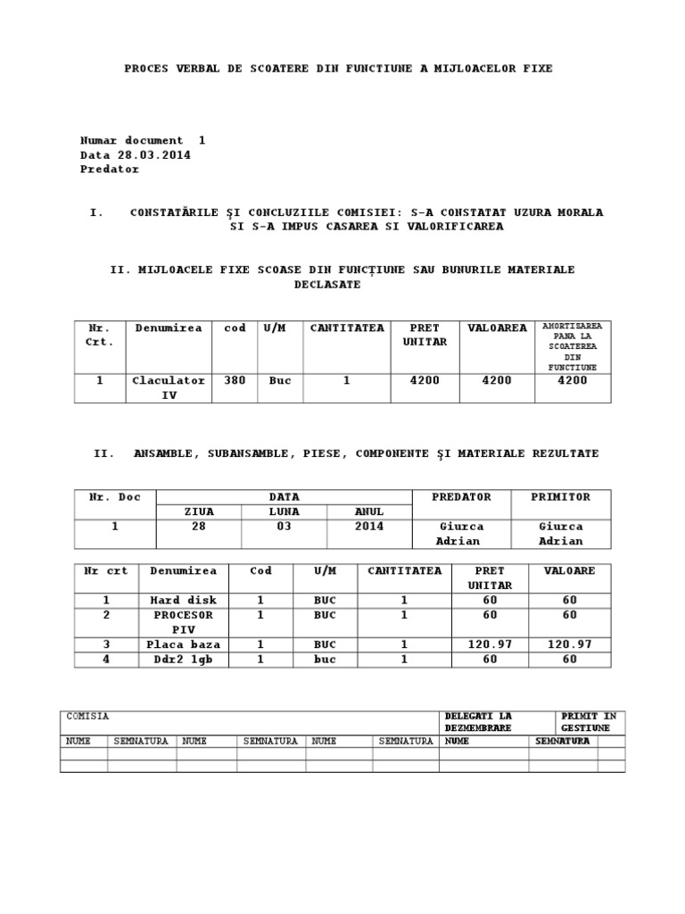 Denumirea cod u/m cantitatea pre valoarea amortizarea. Proces verbal de scoatere din functiune a mijloacelor fixe/ de declasare a unor bunuri materiale de accord mijloacele fixe scoase din funciune sau bunurile materiale declasate nr. Scoaterea mijloacelor fixe din evidentele contabile se poate realiza in baza unei hotarari de guvern.